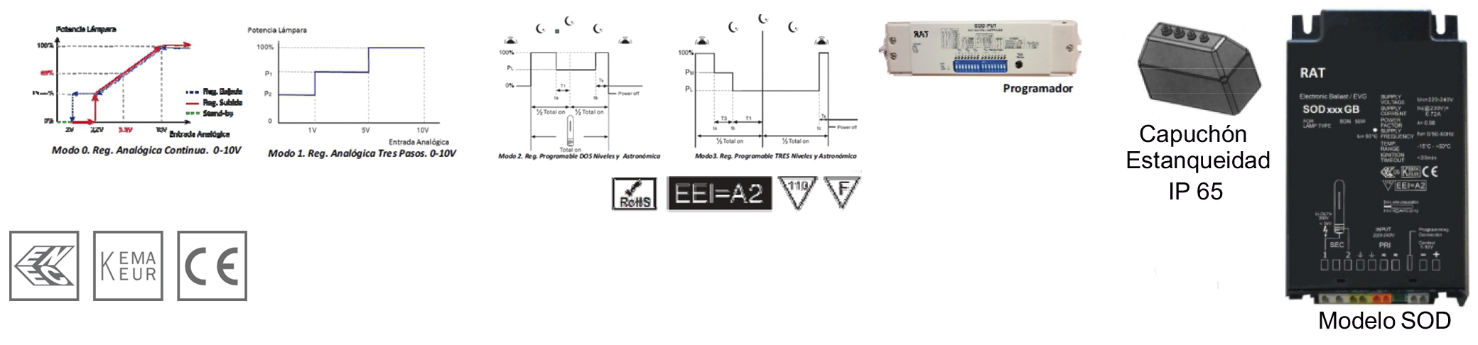 Balastos Electrónicos SODxxx para lámparas de sodio de alta presión y halogenuro. 4 Opciones de Regulación